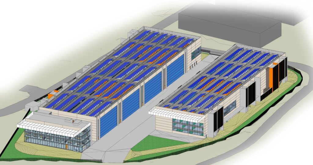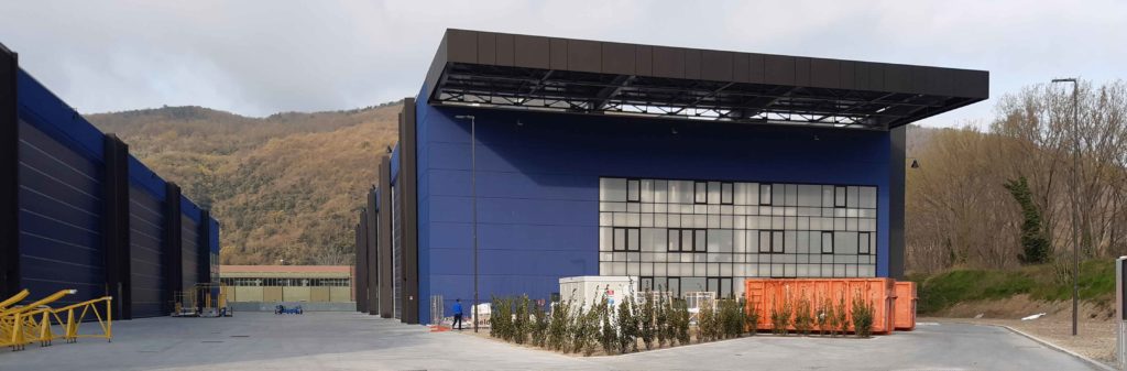 Le strutture dei capannoni sono realizzate in c.a. con pareti non accoppiate, i solai sono costituiti da solette piene in c.a. e sostenute da pilastri a sezione circolare. Tamponamento esterno in pannelli prefabbricati.