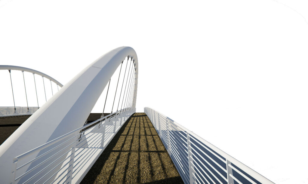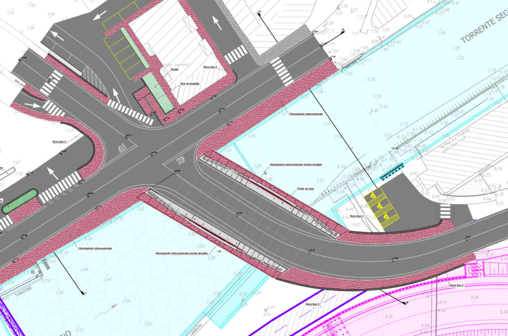 L’opera di attraversamento del Segno sarà costituita da un ponte ad arco superiore. L’arco, il tirante ed i pendini saranno in acciaio, mentre il piano carrabile sarà realizzato in sistema misto con profili commerciali HEB 600 in acciaio connessi ad una soletta in C.A. per mezzo di pioli tipo Nelson. Le mensole laterali, che costituiscono la struttura portante dei futuri marciapiedi, saranno realizzati con profili in acciaio composti saldati, dotati di opportuni fori atti ad alloggiare le tubature dei sottoservizi aggraffati all’impalcato.