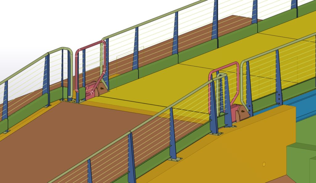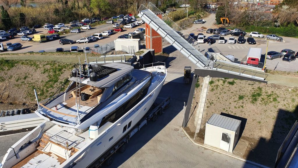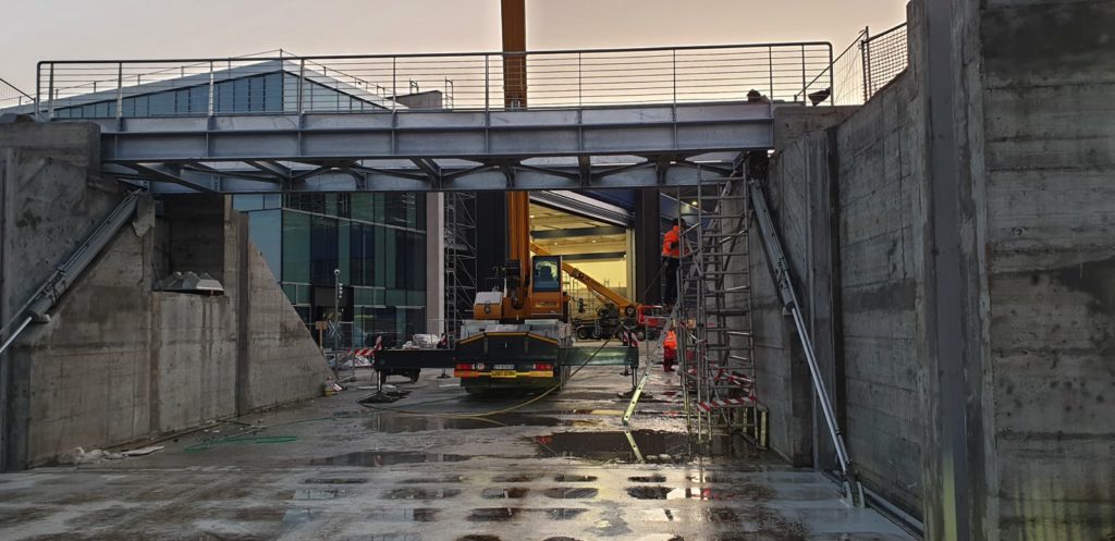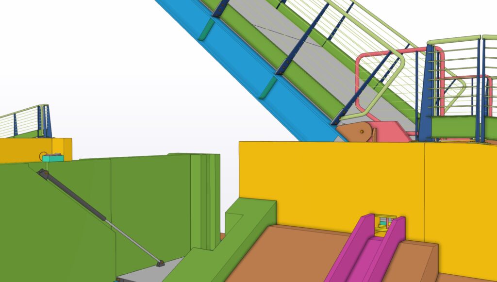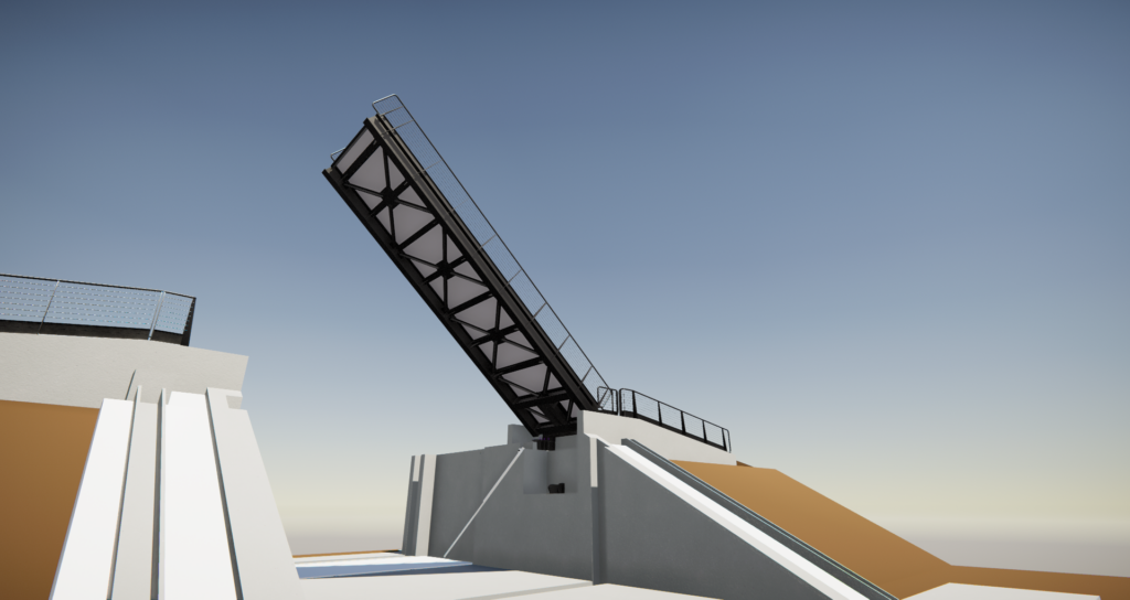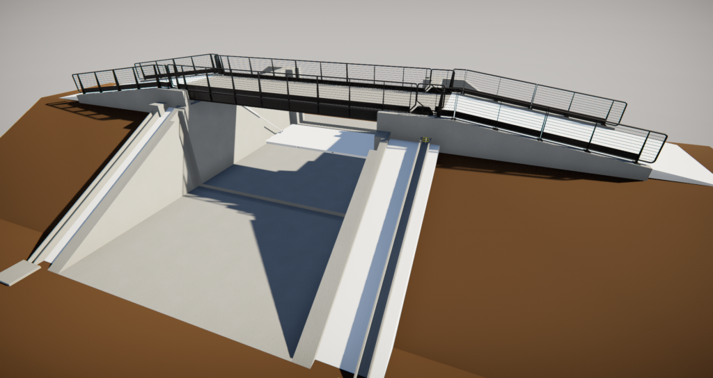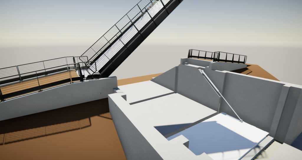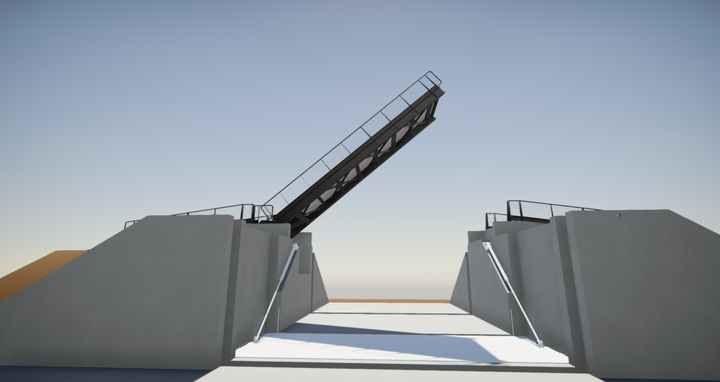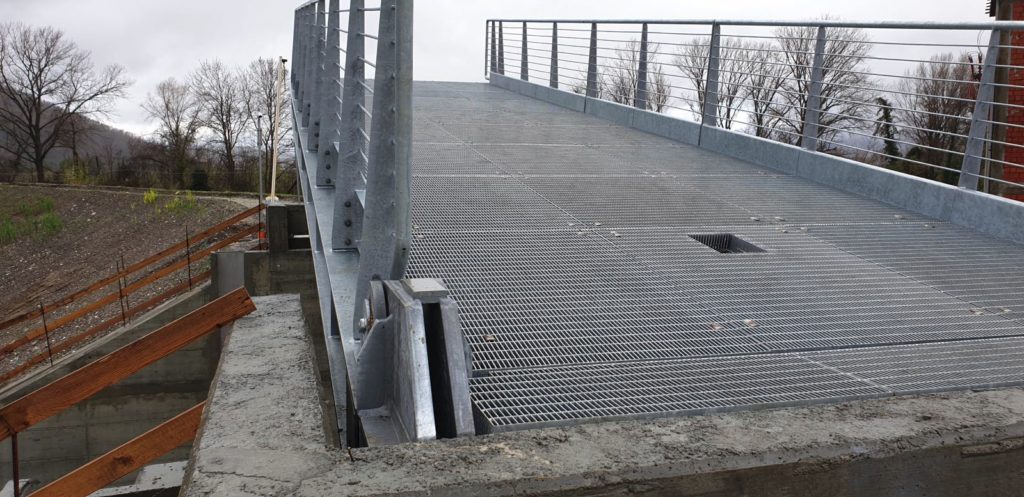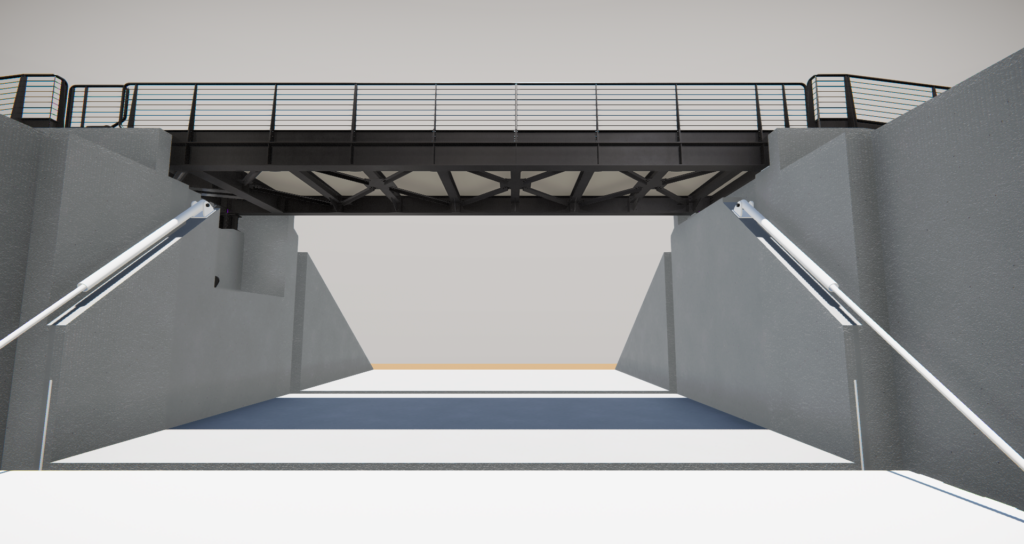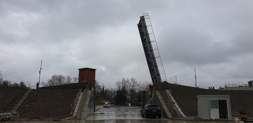 In relazione alle future esigenze di fruizione della sommità del rilevato arginale l’attraversamento è stato dotato di una passerella apribile. Il varco ha una luce netta pari a 10 m e un’altezza di 4.50m per consentire, nelle normali condizioni di utilizzo, il transito di autotreni e autoarticolati, mentre nelle condizioni operative di passaggio delle imbarcazioni trasportate da un carrellone motorizzato sarà necessario procedere all’apertura della passerella. La passerella è normalmente chiusa consentendo il transito sulla sommità dell’argine e dei mezzi d’opera nel varco sottostante.