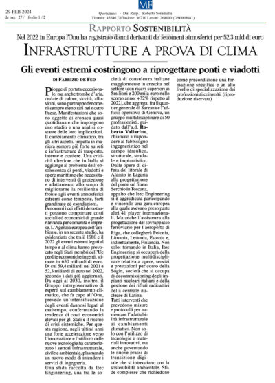 Il cambiamento climatico, tra gli altri aspetti, impatta in maniera sempre più forte su reti e infrastrutture di trasporto, interne e costiere. Una criticità ulteriore che in Italia si aggiunge al problema dell’ obsolescenza di ponti, viadotti e opere marittime che necessitano di interventi di protezione e adattamento allo scopo di migliorarne la resilienza di fronte agli eventi atmosferici estremi come tempeste, forti grandinate ed esondazioni. Fenomeni i cui effetti devastanti possono comportare costi sociali ed economici di grande rilevanza per comunità e imprese. L’Agenzia europea dell’ambiente, in un recente studio, ha evidenziato che tra il 1980 e il 2022 gli eventi estremi legati al tempo e al clima hanno provocato negli Stati membri dell’Ue perdite economiche ingenti, stimate in 650 miliardi di euro. Di cui 59,4 miliardi nel 2021 e 52,3 miliardi di euro nel 2022, secondo i dati più aggiornati.