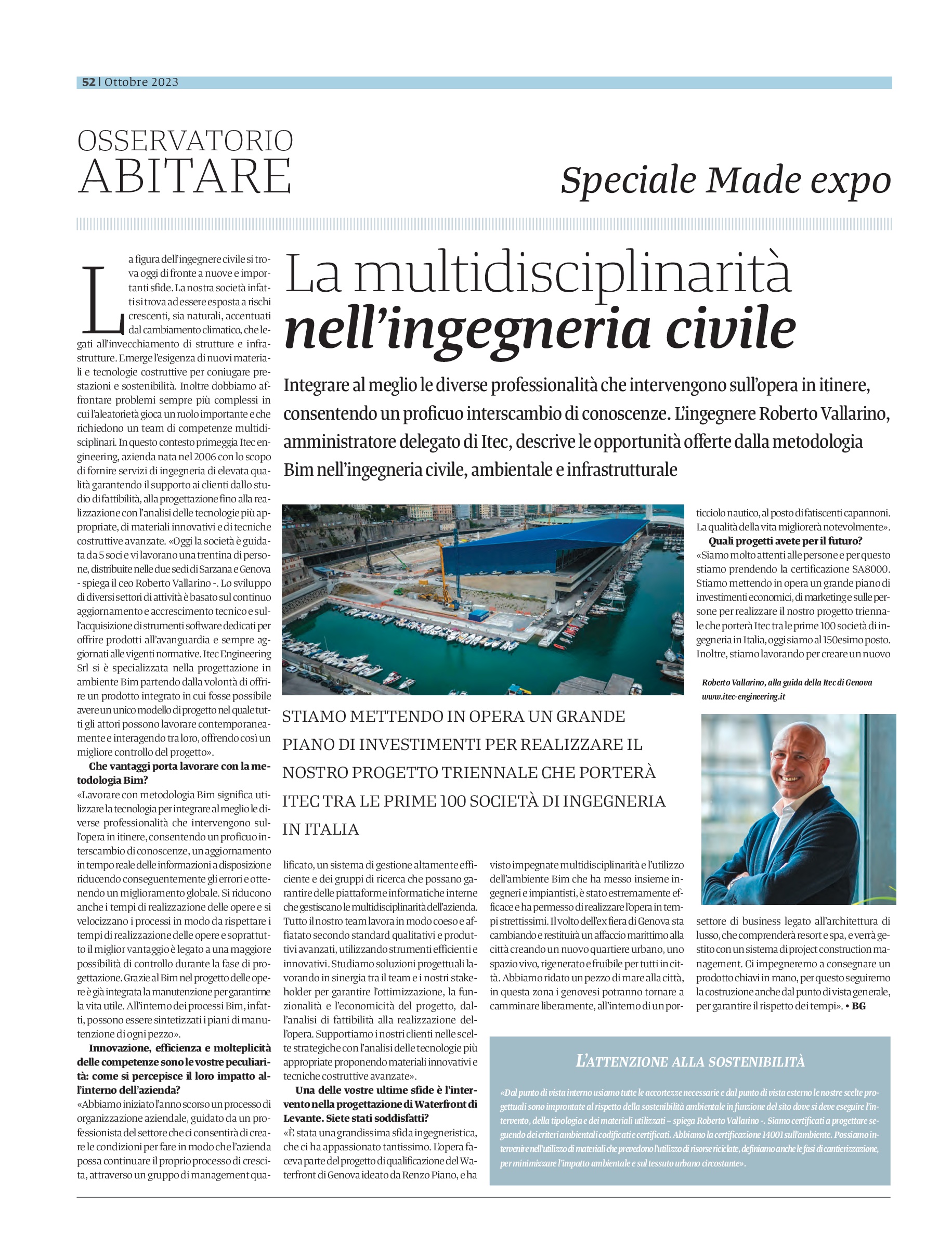 L’ingegnere Roberto Vallarino, amministratore delegato di Itec, descrive le opportunità offerte dalla metodologia Bim nell’ingegneria civile, ambientale e infrastrutturale. Stiamo mettendo in opera un grande piano di investimenti economici, di marketing e sulle persone per realizzare il nostro progetto triennale che porterà Itec tra le prime 100 società di ingegneria in Italia, oggi siamo al 150esimo posto. Itec Engineering Srl si è specializzata nella progettazione in ambiente Bim partendo dalla volontà di offrire un prodotto integrato in cui fosse possibile avere un unico modello di progetto nel quale tutti gli attori possono lavorare contemporaneamente e interagendo tra loro, offrendo così un migliore controllo del progetto».