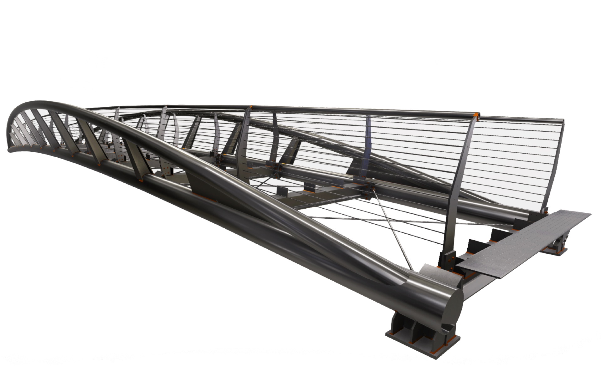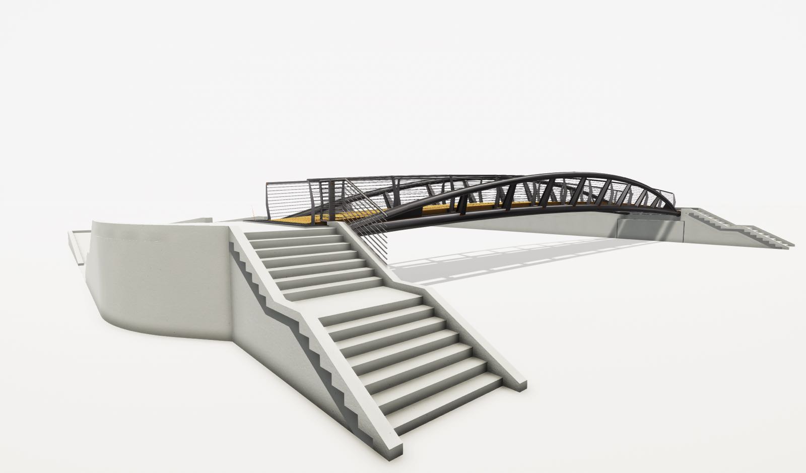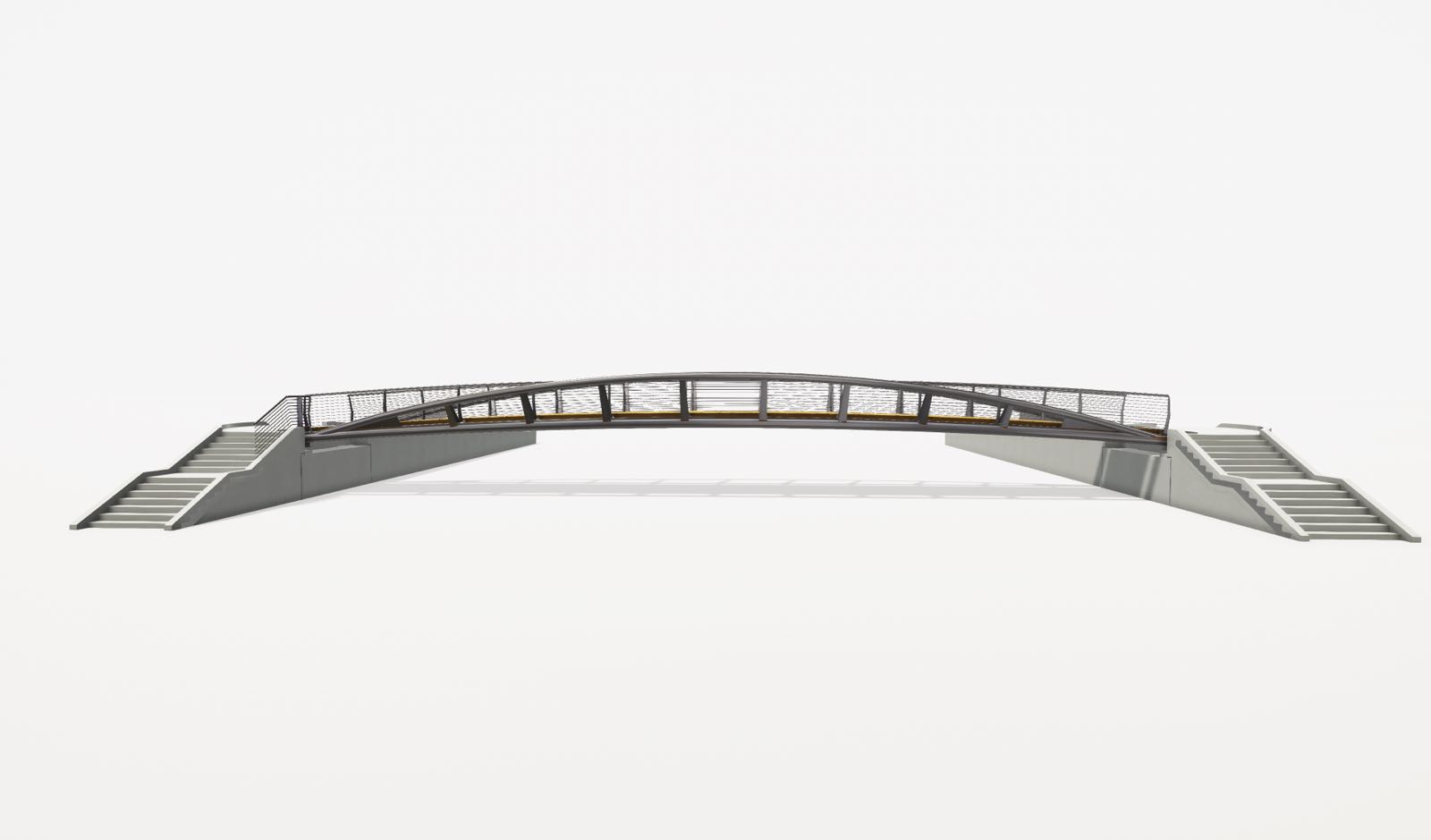 Il concept design è quello di una struttura leggera, in grado di soddisfare contemporaneamente esigenze funzionali ed estetiche, nel rispetto dei limiti imposti dai vincoli idraulici, coniugando la necessità di contenere il dislivello che si viene a creare tra il piano di calpestio di progetto e l’attuale piano stradale. La passerella ciclo-pedonale presenta una luce libera fra gli appoggi di 28 m e piano di calpestio pari a 2,50 m con profilo longitudinale curvilineo. La struttura della passerella è sostenuta da una coppia di archi collegati da profili a doppio T a sezione variabile.