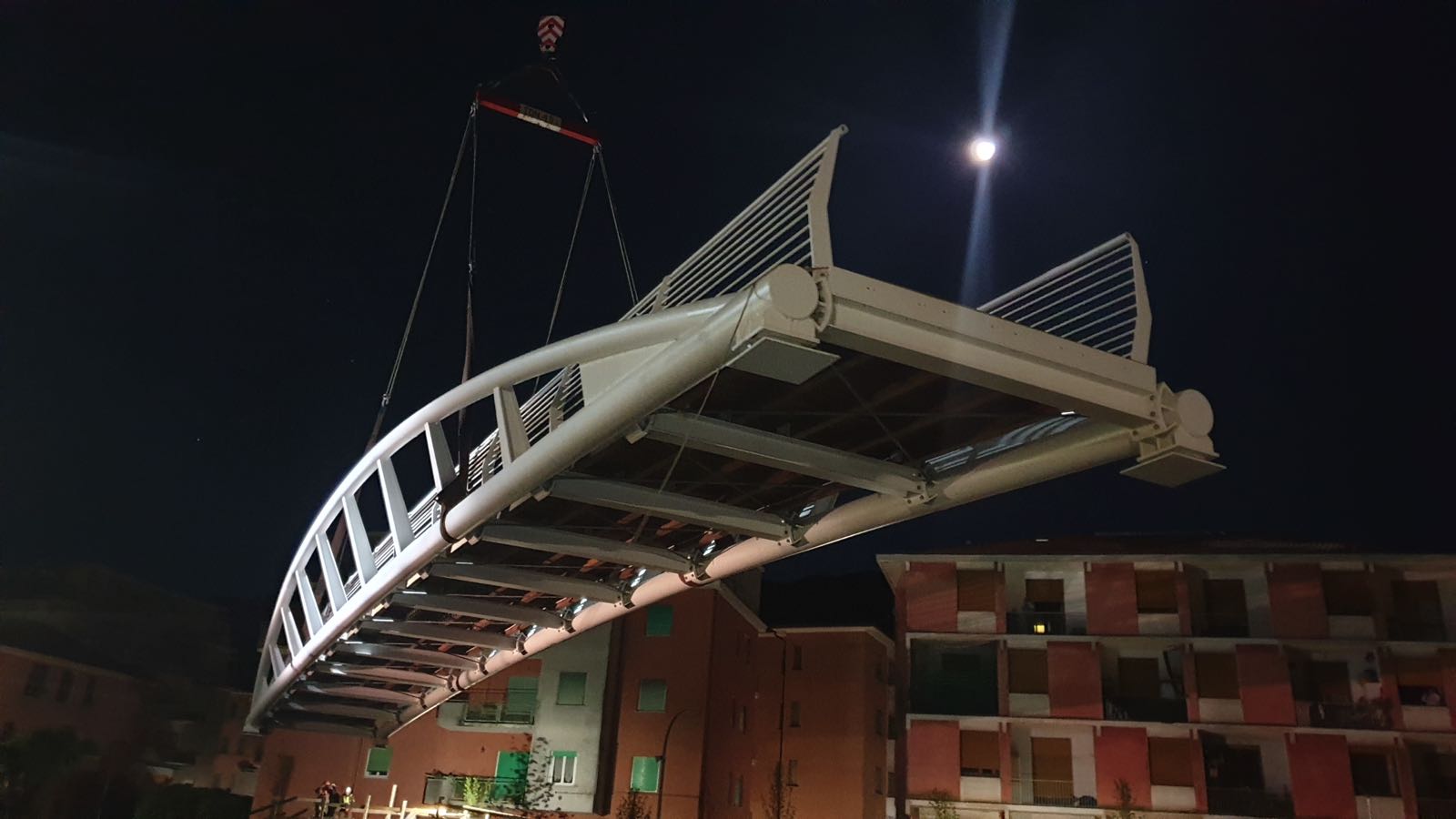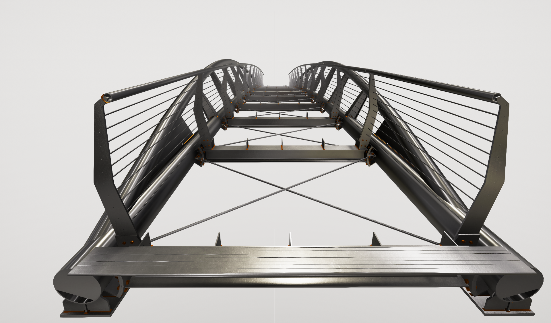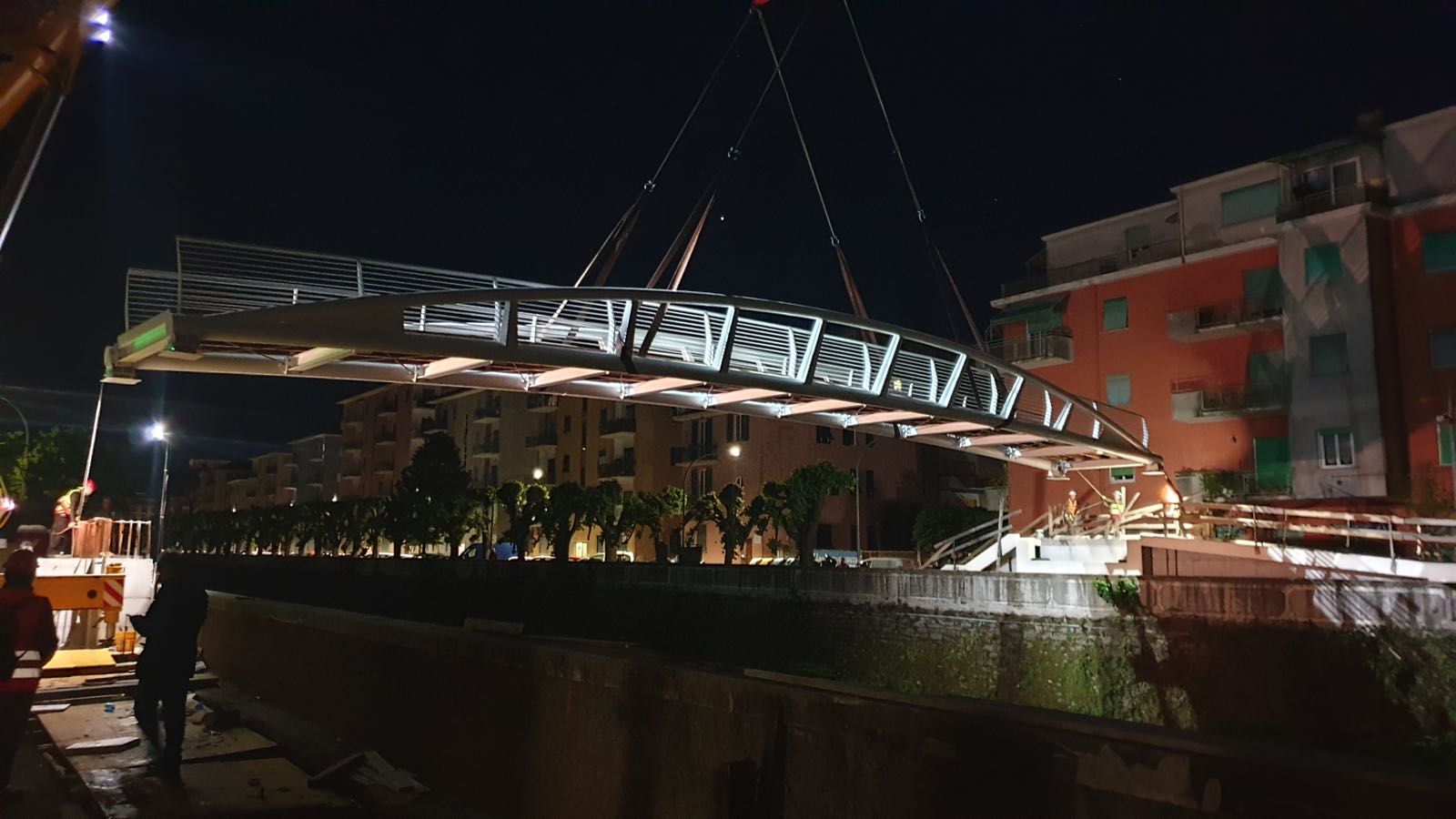 Il concept design è quello di una struttura leggera, in grado di soddisfare contemporaneamente esigenze funzionali ed estetiche, nel rispetto dei limiti imposti dai vincoli idraulici, coniugando la necessità di contenere il dislivello che si viene a creare tra il piano di calpestio di progetto e l’attuale piano stradale. La passerella ciclo-pedonale presenta una luce libera fra gli appoggi di 28 m e piano di calpestio pari a 2,50 m con profilo longitudinale curvilineo. La struttura della passerella è sostenuta da una coppia di archi collegati da profili a doppio T a sezione variabile.