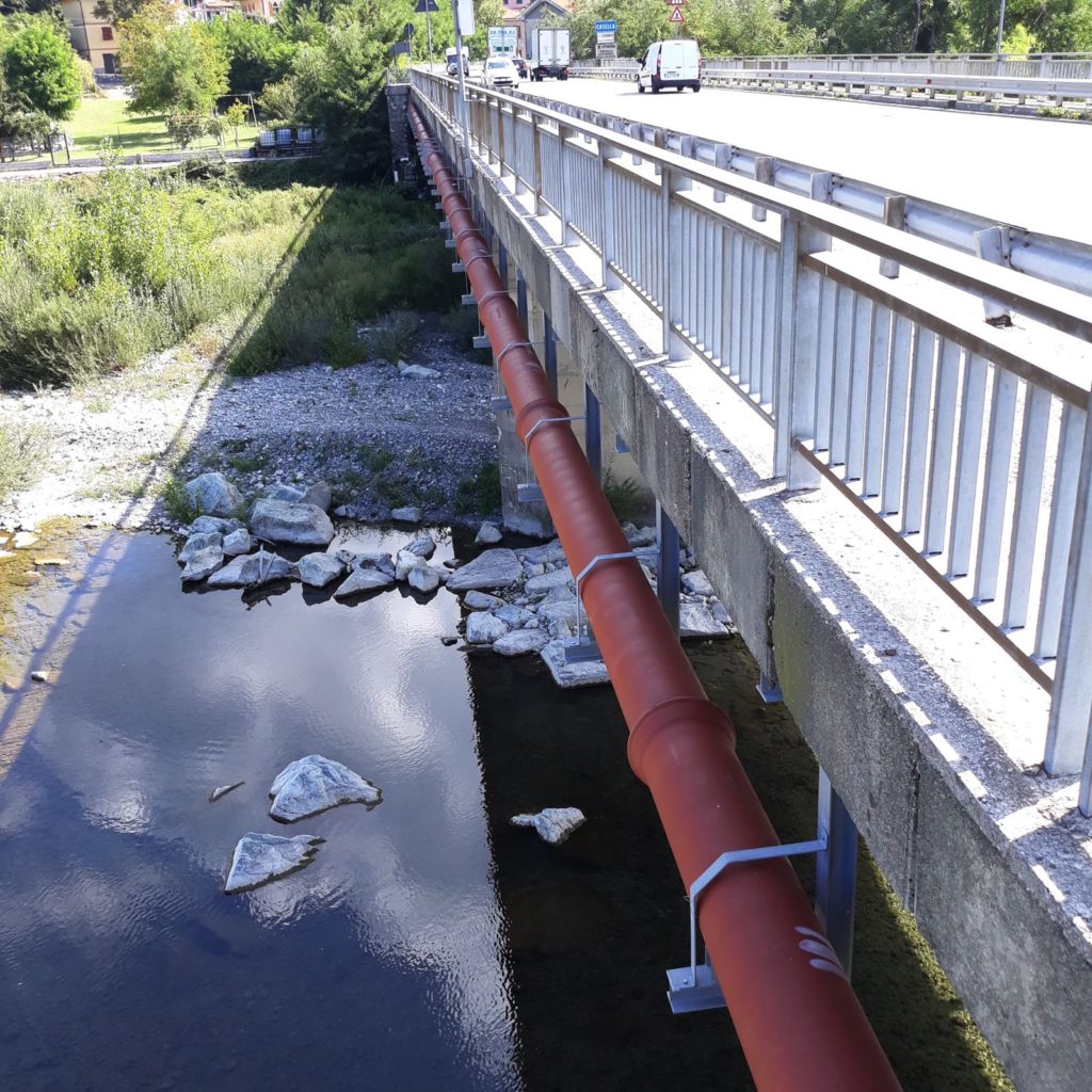 A causa della configurazione del sito, della posizione plano-altimetrica degli abitati e dei punti di recapito delle reti fognarie locali esistenti, si è reso necessario progettare n. 5 stazioni di sollevamento-rilancio, aventi il compito di raccogliere i reflui nei punti di minima quota, di allontanarli dal torrente Scrivia e di convogliarli lungo la viabilità provinciale. Il collettore fognario è costituito da condotte in PVC DN400 SN8 per i tratti a gravità, Pead De 200/250 PN10 per i tratti in pressione interrati e in GS DN200 per i tratti in pressione aggraffati. L’adduttrice idrica è costituita da condotte in GS DN250.